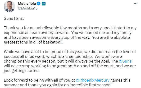 致太阳队球迷: 感谢你们陪我度过了令人难以置信的几个月并为我作为球队老板提供了一个非常特别的开始。你们欢迎我和我的家人,并且一路走来都很棒。你们绝对是篮球界最伟大的球迷。 虽然今年我们有很多值得骄傲的地方,但我们并没有达到所有人都想要的成功,那就是总冠军。我们不会每个赛季都赢得冠军,但它永远是我们的目标,永不止步,我们才刚刚开始。
