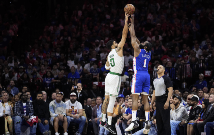 76人和凯尔特人G6关键一战,费城开场进攻不顺,恩比德、哈登和哈里斯三大核心都频频打铁,76人被打15-3瞬间落后12分,随后马克西得分止血,费城9-0追到3分;暂停回来,布罗格登接连轰进3记三分对飚76人,第一节打完76人落后7分,哈登单节4中0一分未得,外线三分出手惨遭塔图姆大帽、恩比德5中1和哈里斯6中1。