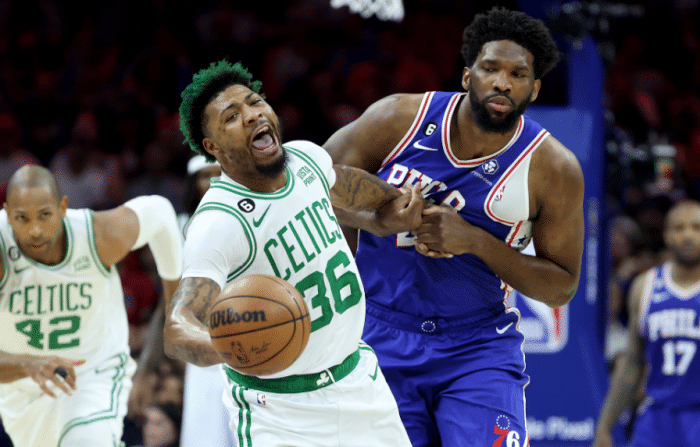 第二节,哈登终于得分,无奈绿军火力太猛,76人一度落后多达16分;随后76人反扑,哈登连续失误后持球突破杀到禁区单臂劈扣,如此一扣点燃球队,恩比德和马克西扛起进攻大旗,半场打完费城仍旧落后7分。下半场,76人第三节起势,恩比德鱼跃扑抢地板球,禁区大帽布朗,哈登推动反击并且助攻尼昂轰进三分,费城终于扭转局面;哈登抢断后马克西反击上篮,登帝组合带队反超2分进入末节。