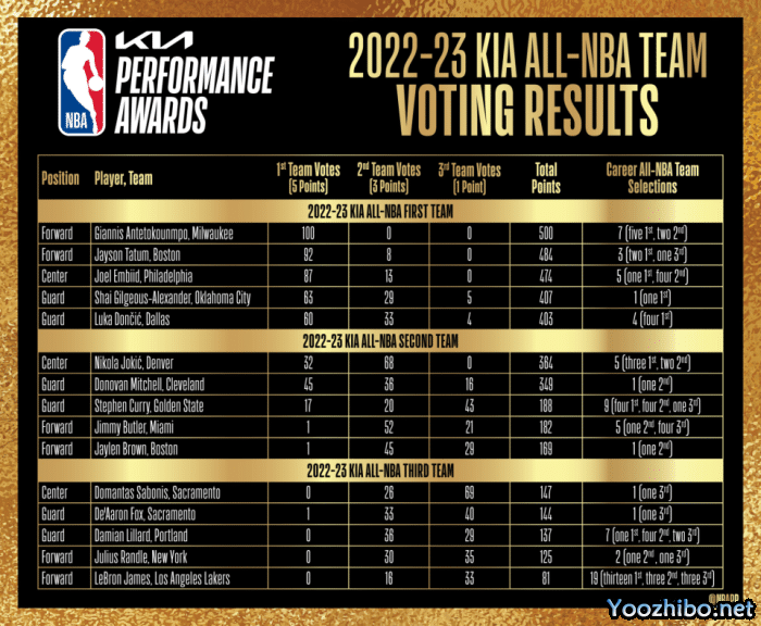 入选二阵的包括米切尔、巴特勒、库里、布朗、约基奇;入选三阵的包括福克斯、利拉德、詹姆斯、兰德尔、萨博尼斯。字母哥连续5年全票入选一阵!