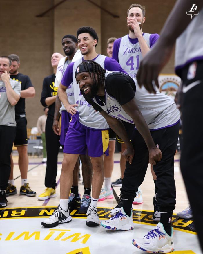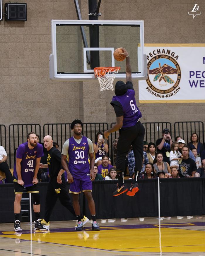 在今天的公开训练赛中,詹姆斯和威少都是身穿紫色球衣,他们两人同一队,和他们同队的还有达米安-琼斯、纳恩和斯威德;浓眉参加了训练,但他没有在媒体面前出战对抗赛。