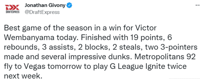 24直播网10月01日讯 ,在最新结束的一场法甲比赛中,文班亚马出战32分钟,得到19分6篮板3助攻2盖帽2抢断,帮助球队92-82获胜。选秀专家Givony评价道:“这是文班亚马本赛季至今打得最好的一场比赛。他投进了两个三分球,还有一些令人印象深刻的扣篮。”文班亚马明日将随队飞往拉斯维加斯,下周他将和G联赛的点燃队交锋两次,PK另一位状元热门亨德森。