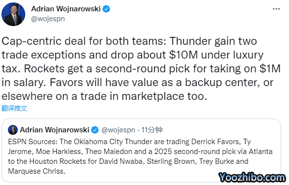 沃纳罗斯基跟进报道,雷霆获得两个交易特例,并将薪金总额降到奢侈税线以下1000万美元,火箭用100万美元的薪水获得一个次轮选秀权;费沃斯将成为有价值的替补中锋,或者可以作为后续交易的筹码。