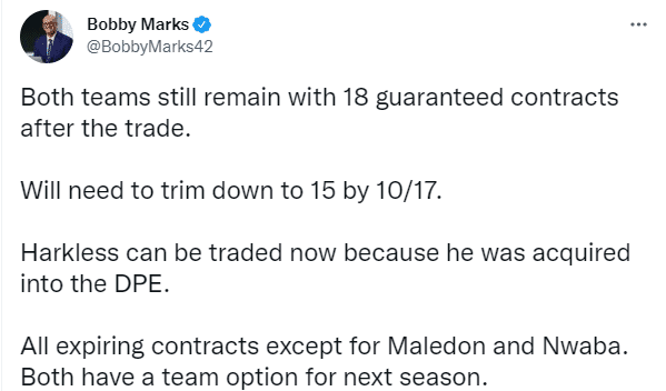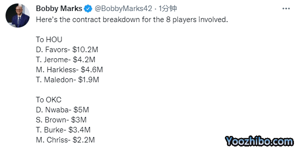 NBA薪资专家Bobby Marks报道,交易结束后,火箭和雷霆两支球队仍然都有18份保证合同 ,他们需要在10月 18日将阵容名额减少到15人;哈克莱斯现在可以交易了,此前他被老鹰交易到雷霆;除了马勒东和恩瓦巴两人之外,其他涉及到交易中的球员都是到期合同,他们两人都有下赛季的球队选项。