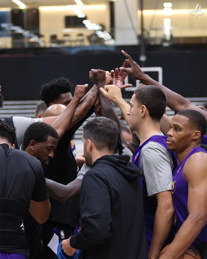 24直播网09月28日,洛杉矶湖人队正式举办训练营,首日训练之后湖人官方晒出训练照,配文写道:训练营第一天;浓眉单挑詹姆斯,两大巨头的表情抢镜;威少抱球目视远方,加布里埃尔满脸笑容,训练之后众球员围在一起击拳加油。