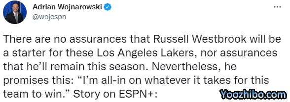 24直播网09月25日,ESPN名记沃纳罗斯基撰文报道,即使没有获得留队保证和首发保证,威少仍旧表示:我会全力以赴帮助湖人获胜;这就是深陷交易流言之中时,威少的心态,甘愿担任任何角色,仍相信湖人三巨头不可阻挡。