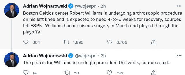 24直播网09月21日,据名记Woj报道,消息人士透露,波士顿凯尔特人的中锋罗伯特-威廉姆斯三世将在本周接受左膝关节镜手术,他预计需要4-6周的时间康复。绿军再次受到伤病打击,此前,绿军新援加里纳利因伤赛季报销。