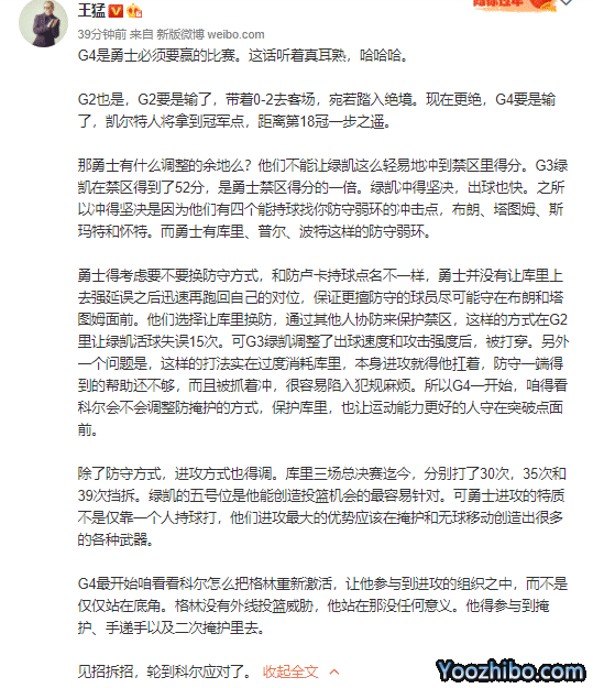 库里的伤病、追梦格林的状态、落后的大比分,都让勇士主帅遇到了很大的难题,而针对勇士在G4的变化,知名篮球人王猛进行支招,他表示勇士在攻防两端都需要进行调整。防守层面勇士让库里换防,通过其他人协防来保护禁区,对于库里的消耗很大。不排除为了保护库里同时让运动能力更好的人守在突破点面前,这样来调整防掩护的方式。