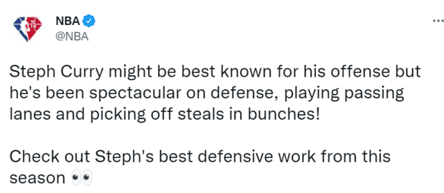 24直播网06月08日讯 ,NBA官方社媒晒出了库里本赛季的防守集锦,并配文写道:“斯蒂芬-库里最出名的可能是他的进攻,但他在防守端的表现也非常出色!”集锦中,库里的抢断和盖帽让人印象深刻,引起球迷热议!