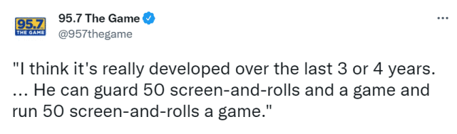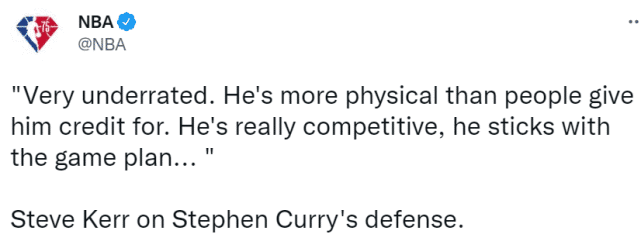 NBA官方社媒还转发了科尔对库里防守的评价。“(他的防守)被明显低估了,他比人们称赞的更加强壮,他真的很拼,严格执行比赛计划……”科尔认为库里的防守在过去3-4年明显进步了。“他现在能一场防50个挡拆,还能一场打50个挡拆。”