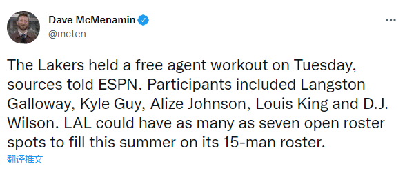 24直播网06月08日讯 ,除了试训郭昊文等年轻人之外,湖人也开始试训自由球员;据NBA记者Dave McMenamin报道,今天湖人试训了五名自由球员,篮网两大旧将在列;还表示湖人今夏可能会有7个空缺位置,换句话说,可能会有7人离队。
