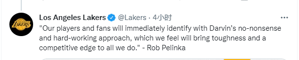 佩总还表示:当加上哈姆复杂的比赛策略和对篮球比赛的深入了解时,我们就有了湖人历史上下一篇章的理想教练人选。我们非常荣幸且自豪地任命哈姆为我们的新任主教练。
