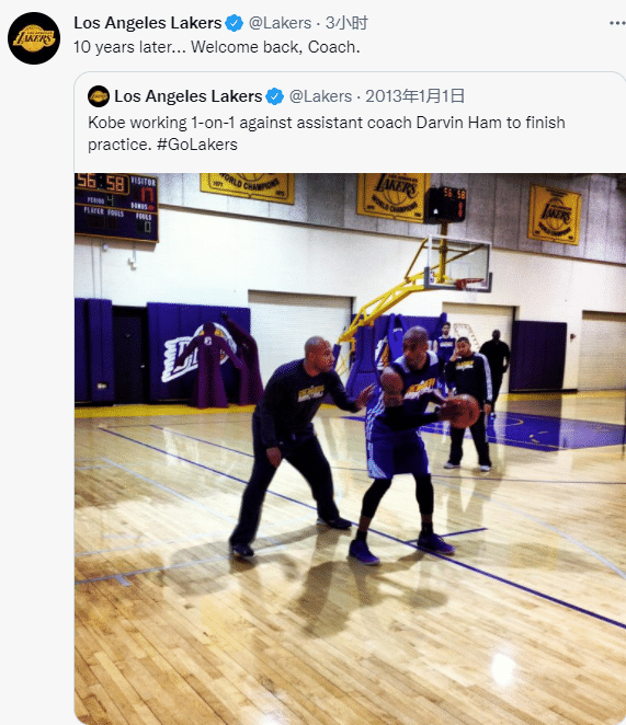 24直播网06月04日讯 日,洛杉矶湖人官方正式宣布,聘请雄鹿助教达尔文-哈姆担任球队新帅,发推写道:欢迎哈姆来到洛杉矶;湖人还转发哈姆与科比训练照,配文:10年后,欢迎回来,教练;哈姆和湖人签下一份4年的执教合同,新赛季他将执教詹姆斯、浓眉等球星,率队冲击总冠军。