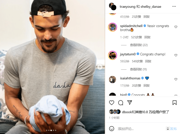 23岁的特雷-杨喜得贵子,塔图姆、米切尔、小托马斯都恭喜他,布克点赞,老鹰官方以及多名队友祝贺吹杨;在这里不禁令人想起昔日的网传——若布克夺冠,詹娜愿意为他生孩子;一晃2年了,布克连续两年冲冠失败,本赛季更是止步西部半决赛。