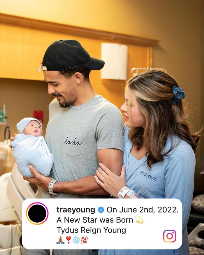 24直播网06月04日讯 ,老鹰球星特雷-杨宣布一大喜讯,他的第一个儿子出生,因此23岁特雷-杨正式升级为爸爸;吹杨在社交媒体上晒出多张照片,并且配文写道:2022年6月3日,一个新星诞生了,孩子的名字是Tydus Reign Young。