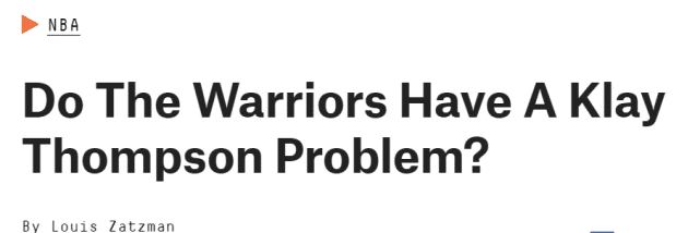 Zatzman指出,克莱的个人表现是出色的,特别是考虑到他在大伤后归来。不过,他在场的时候,勇士的团队表现并没有更加出色也是事实。首先是命中率。汤普森在场时,勇士三分命中率37%,汤普森不在场时,勇士三分命中率40.9%;汤普森在场时,勇士篮下命中率69.6%,而汤普森不在场时,勇士篮下命中率79.5%。
