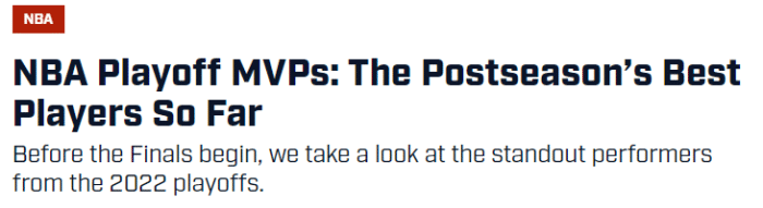 美媒StatMuse评选今年季后赛最佳阵容:后卫线库里和东契奇,前锋分别是巴特勒和塔图姆,内线是字母哥;巴特勒携手四大球星上榜,这也是对巴特勒的一种认可。