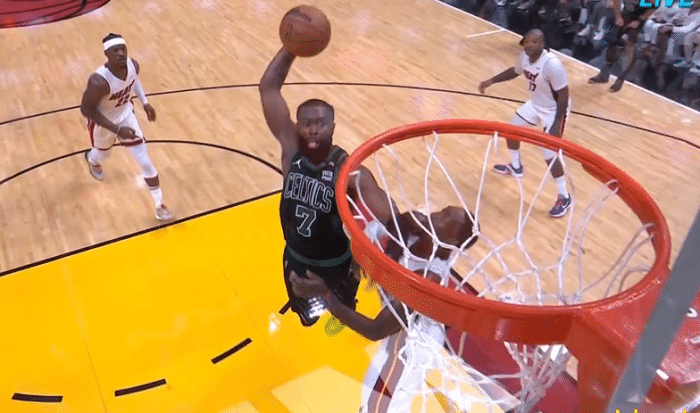 24直播网05月26日讯 ,凯尔特人做客93-80击败热火,攻占天王山,3-2拿到赛点。此役前两节半双方打得非常惨烈,防守大战中谁也无法拉开比分。但从第三节末段开始,凯尔特人开始爆发,轰出了一波24-2的超级攻击波,一举奠定胜局!布朗末节上演死亡隔扣,技惊四座!