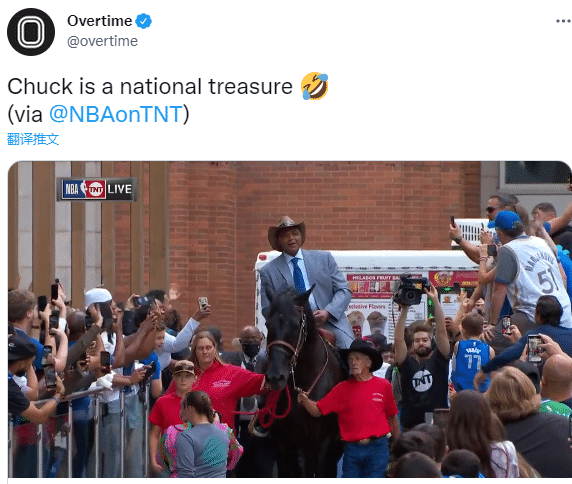 巴克利骑马力挺独行侠引热议,美媒OverTime转发视频并且发推写道:巴克利是国宝。