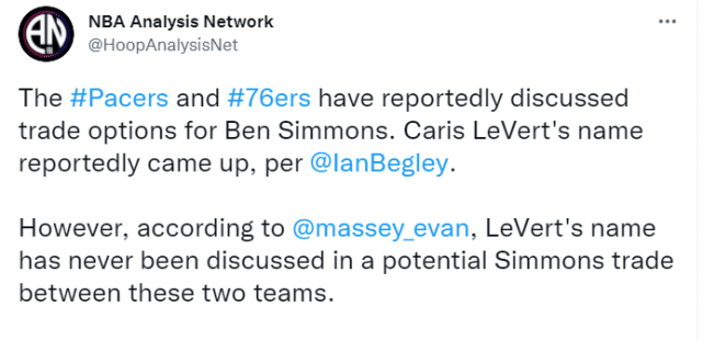 据NBA记者Ian Begley报道,消息人士透露,步行者已经和76人谈过本-西蒙斯的交易,勒维尔是这些讨论中被提到的球员之一。不过,另一位记者Evan Massey却第一时间表示,在双方潜在的交易谈判中,勒维尔的名字从未被提及。