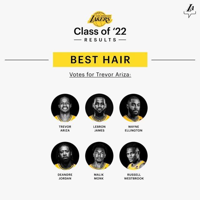 媒体日当天,湖人官方组织了一项有趣的投票活动,票选队内的10大奖项:最佳着装、鞋王、耍宝王、最佳发型、最佳能量、派对王、最佳投手、最佳扣将、最佳DJ、最乱更衣柜。现在两个奖项已经揭晓,詹姆斯9票当选鞋王,阿里扎6票拿下最佳发型奖。