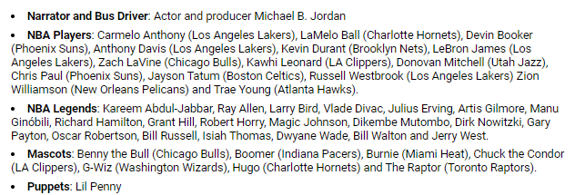 参演吉祥物:公牛队、步行者队、热火队、快船队、奇才队、黄蜂队和猛龙队。