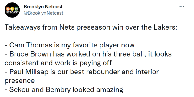 24直播网10月04日讯 ,篮网123-97大胜湖人,取得了季前赛的首场胜利。双方均有多名核心缺阵,对于篮网而言,这场大胜没有什么实质意义,但美媒Brooklyn Netcast指出球队还是有四大收获。
