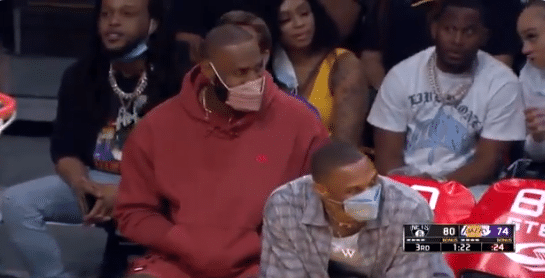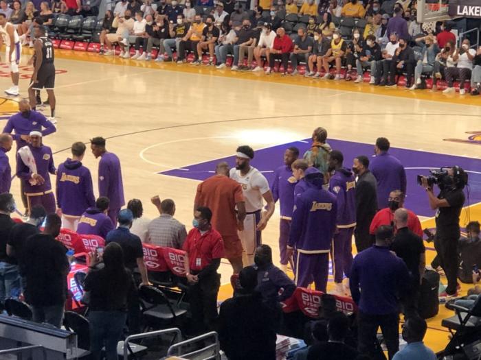 浓眉下场休息并与队友击掌,当时詹姆斯站在场边,正在和威少闲聊;就在浓眉扭头去找座位时,威少叫住浓眉,并且把座位让给浓眉,之后詹姆斯坐在浓眉身旁。