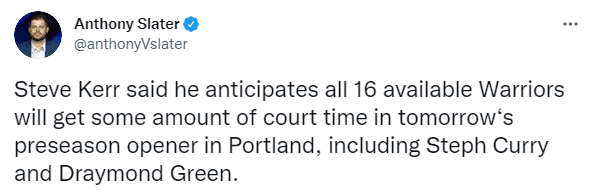 24直播网10月04日讯 ,NBA季前赛已经正式打响,勇士众将都能上场参加比赛,据勇士记者Anthony Slater报道,科尔表示,预计所有16名可用的勇士球员都将在明天对阵波特兰开拓者的季前赛揭幕战中获得一定的上场时间,包括斯蒂芬-库里和德雷蒙德-格林。