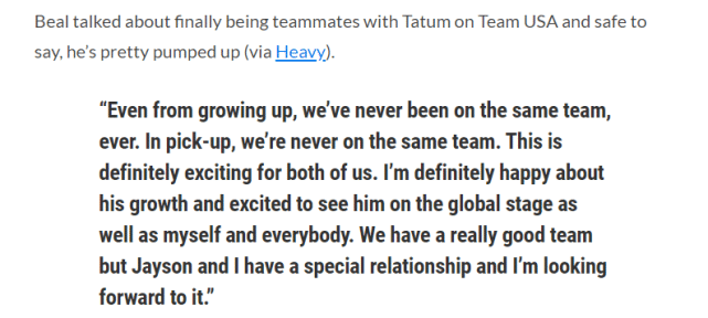 比尔此次因新冠检测阳性无缘奥运会,也错过了和塔图姆一起为美国男篮打球的机会。此前接受采访时,比尔曾表示自己和塔图姆从小都没有在一支球队打过球,这次能共同效力国家队,两人都非常兴奋。遗憾的是,最终这一愿望落空。不过,他俩现在有机会在同一支NBA球队效力了。美媒报道称,如果凯尔特人要通过交易得到比尔,他们最可能送出的筹码是杰伦-布朗。