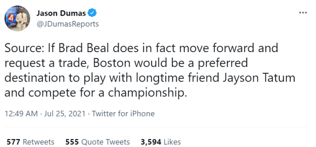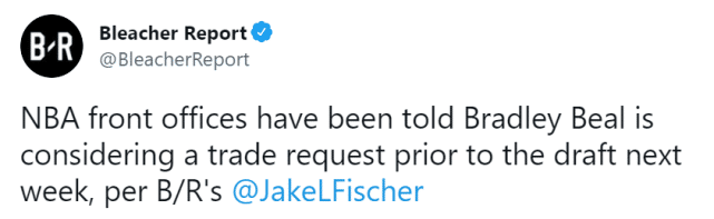 24直播网讯 北京时间7月25日,据Bleacher Report(B/R)记者Jake Fischer报道,奇才球星布拉德利-比尔考虑在选秀大会前申请交易,而B/R的另一位记者Jason Dumas爆料称,如果比尔决定申请交易,他的首选下家将是凯尔特人。