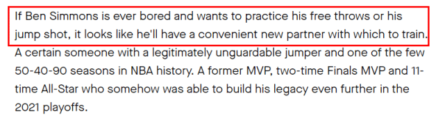 美媒调侃杜兰特可以教西蒙斯罚球,确实也有数据支撑,毕竟阿杜在罚球方面比西蒙斯可强多了。2020-21赛季常规赛,西蒙斯的罚球命中率是61.3%,杜兰特是88.2%。季后赛,西蒙斯的罚球命中率是34.2%,杜兰特是87.1%。
