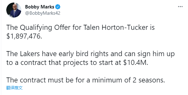 20岁霍顿-塔克在2019年和湖人签下2年242万美元的合同,平均年薪仅120多万美元,如今他的合同到期了,湖人为他提供资质报价,从而可以匹配别队给他的合同,湖人此举目的就是想尽可能续约塔克。