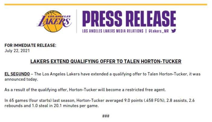 24直播网讯 北京时间7月23日,据名记shams报道,湖人已经给霍顿-塔克提供了资质报价,从而让塔克成为一名受限制的自由球;之后湖人正式官宣这一决定,有权匹配任何报价,可签2年1900万。