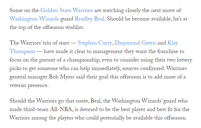 勇士记者还透露,如果比尔申请离队奇才,他将会成为勇士首要引援目标。