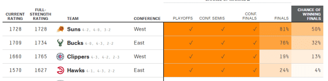 上场输给快船之后,太阳的晋级概率下降到了81%,夺冠概率也来到了45%。此番字母哥受伤之后,太阳的夺冠概率已经到了50%。