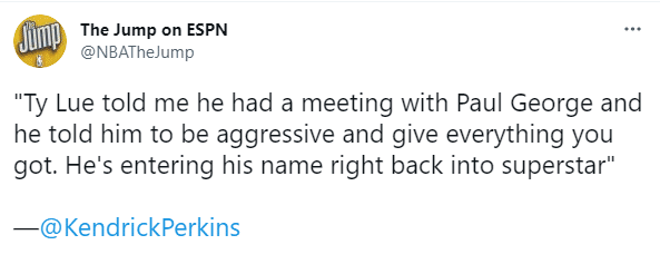 24直播网讯 北京时间6月30日,快船主教练泰伦卢激励乔治的内容曝光,据名嘴帕金斯透露,泰伦卢和乔治开过一个小会,他告诉乔治要打得有侵略性并且拼尽全力,并且直言乔治已经属于超级巨星的行列之中;乔治一战征服帕金斯,前NBA球员更是直言乔治就是超巨。