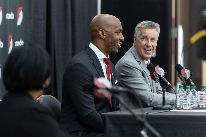 比卢普斯首次以主教练的身份亮相,对着镜头满脸笑容十分开心,开拓者球星CJ-麦科勒姆来到现场力挺新帅,与比卢普斯面对面聊起来,考文顿也来了,他们两人都是穿着拖鞋。