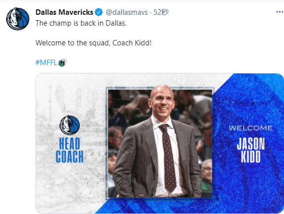 24直播网讯 北京时间6月29日,达拉斯独行侠正式官宣,杰森=基德正式成为独行侠队史第十任主教练,独行侠官方发推写道:那个总冠军重返达拉斯,欢迎来到球队,基德教练;独行侠还在今天正式任命尼科-哈里森成为球队新任总经理。