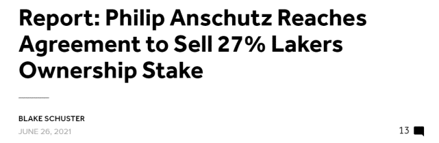 24直播网讯 北京时间6月26日,据美媒报道,81岁亿万富翁菲利普-安舒茨已经和匿名买家达成协议,出售他所拥有的湖人27%的股份。目前,这一协议还没有通过NBA董事会的正式审批。