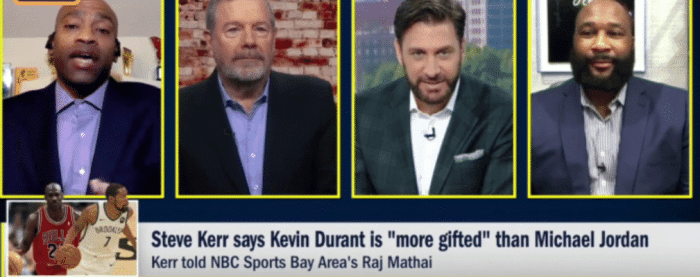 而“美国杨毅”则在另一档节目中隔空回应了这个话题:除了技术,身体、球商之外,心态也是一种天赋,乔丹没有在自己失败的时候抱团,这是他比詹姆斯和杜兰特都强的一点。