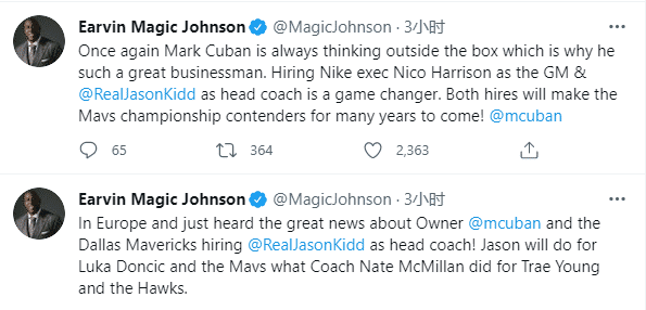 湖人名宿魔术师也恭喜基德,发推写道:基德将为东契奇和独行侠所带来的,就像麦克米兰为特雷杨和老鹰所做的一样,基德将让独行侠成为未来几年总冠军的有力争夺者。