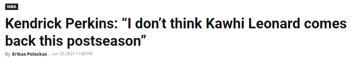 名嘴帕金斯也直言小卡提前赛季报销,帕金斯表示:我认为莱昂纳德不会在今年季后赛中回来了,任何关于前十字韧带的伤势都要特别小心对待。
