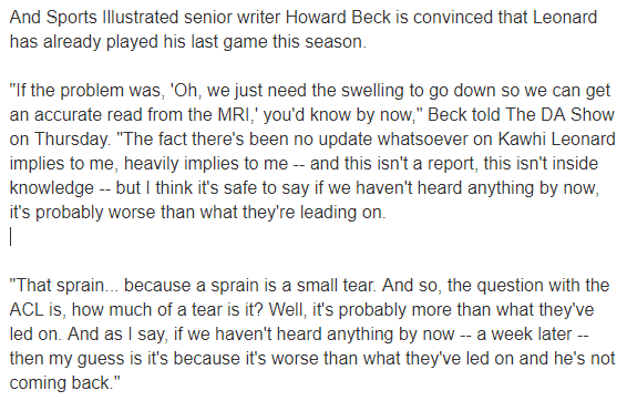 《体育画报》记者Howard Beck认为小卡已经打完了本赛季最后一场比赛,名记表示:如果小卡只是消肿,我们早就知道他的核磁检查结果了,但事实是快船没有更新任何消息,这暗示小卡的伤势比预期更糟糕;扭伤意味着撕裂,问题是小卡的十字韧带撕裂有多严重,到现在都没有他的任何消息,所以我觉得他的情况比快船所说的更糟糕,他不会回来了。