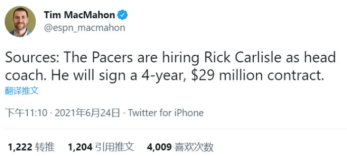 24直播网讯北京时间6月24日,来自名记蒂姆·麦克马洪的报道,步行者将聘请前独行侠主帅卡莱尔,担任球队新的主教练。双方将签订一份为期4年,总价2900万美元的合同。卡莱尔曾在2003年到2007年执教步行者,并一度率队打出61胜21负的骄人战绩。此番再续前缘,步行者显然希望卡莱尔率队迎来突破!