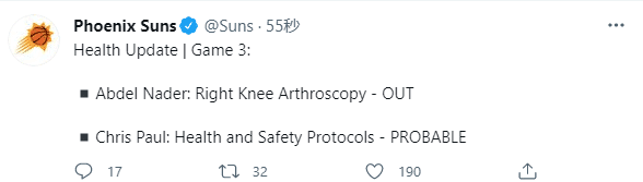小卡继续伤停,但保罗复出在即——此前名记克里斯-海耶斯透露保罗已经顺利通过结束隔离前的最后一步,并且计划G3复出;随后太阳官方宣布,保罗大概率出战西决第三战,出战状态升级;因此不出意外的话,保罗很可能G3复出。
