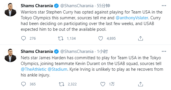 24直播网讯 北京时间6月22日,美国男篮大名单人数又增加了,据名记shams报道,篮网球星詹姆斯-哈登已经承诺参加东京奥运会,他将和杜兰特一起出战,而欧文由于脚踝伤势,不太可能出战奥运会;另外库里和米切尔都已拒绝美国男篮的邀请,决定不参加奥运会。