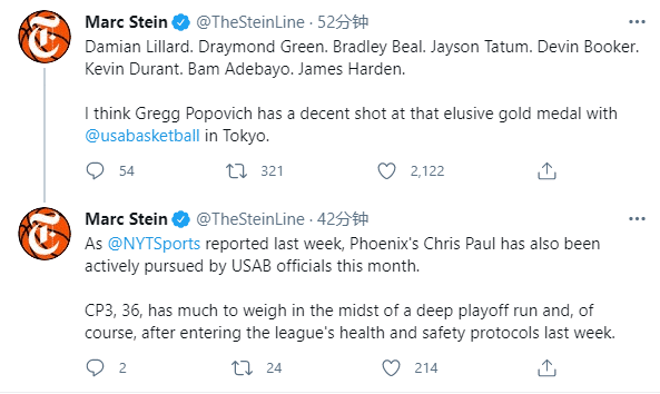 截止到目前,已有8位NBA球星承诺参加奥运会,名记Marc Stein列出这份名单——利拉德、德拉蒙德-格林、比尔、塔图姆、布克、杜兰特、阿德巴约和哈登,并且直言我认为波波维奇有望夺得东京奥运会金牌;目前美国男篮还在积极邀请保罗,CP3还没有做出决定。