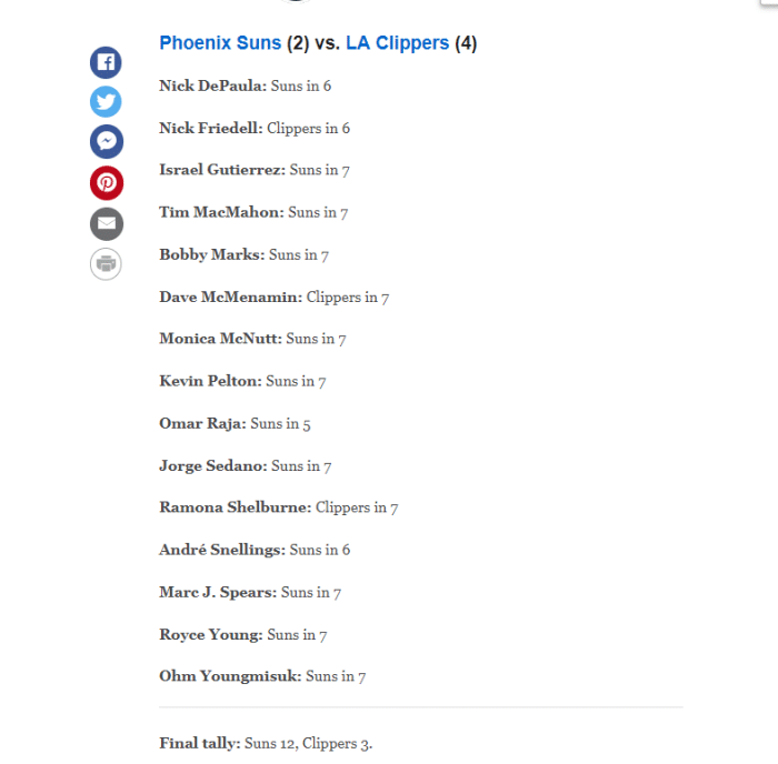24直播网讯 北京时间6月21日,西部决赛太阳和快船的首战,就将在菲尼克斯进行。西决之前,ESPN15名专家对于这轮系列赛做了预测。结果显示12人看好太阳,3人看好快船。