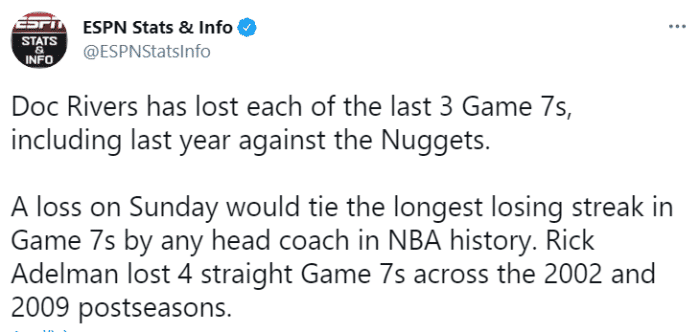 24直播网讯 北京时间6月21日,NBA东部半决赛费城和老鹰迎来最后的抢七。赛前,ESPN统计了一项数据,让费城主帅里弗斯比较尴尬。根据统计,里弗斯在过往3个抢七中全部败北。而一旦这场继续输球,他将追平NBA历史上抢七最长的4连败,而之前保持这一纪录的是阿德尔曼。